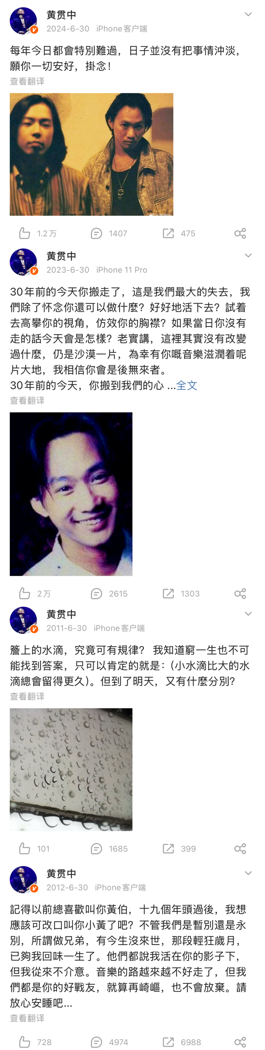 自2011年起,每年的6月30日,黃貫中都會在微博上懷念黃家駒,漫漫十五載,不曾缺席。