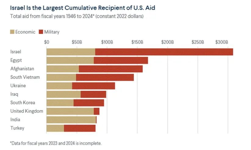 根據美國外交關係協會(Council on Foreign Relations)的研究,1946年至2024年間,以色列雖非北約成員國,甚至未與美國簽訂正式防務協議,卻累計獲得超2280億美元美軍援,成為該時期美軍事援助的最大受援國。以色列78%的武器裝備依賴美國供應。