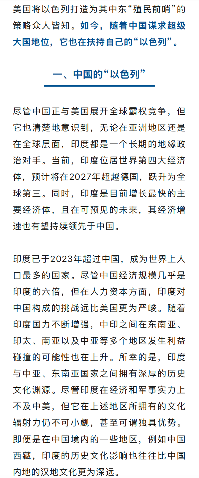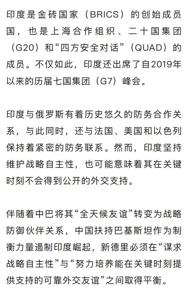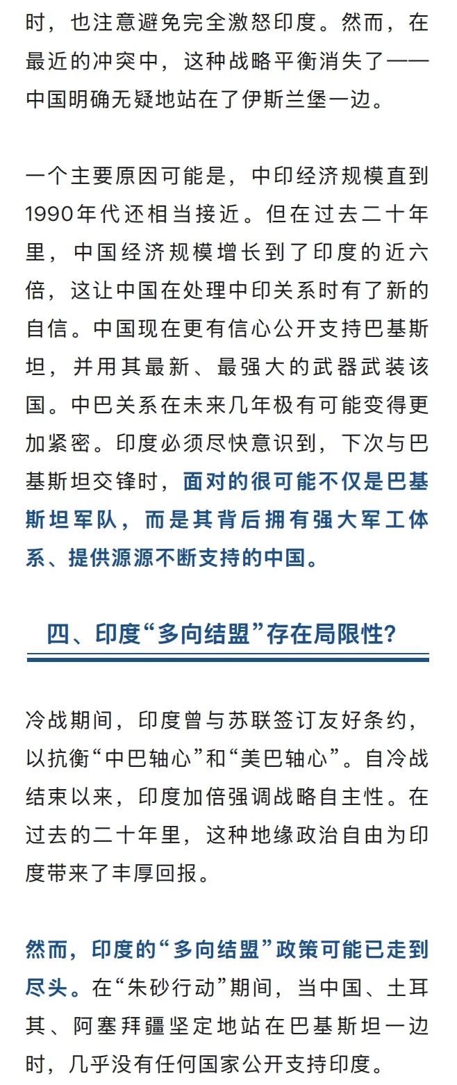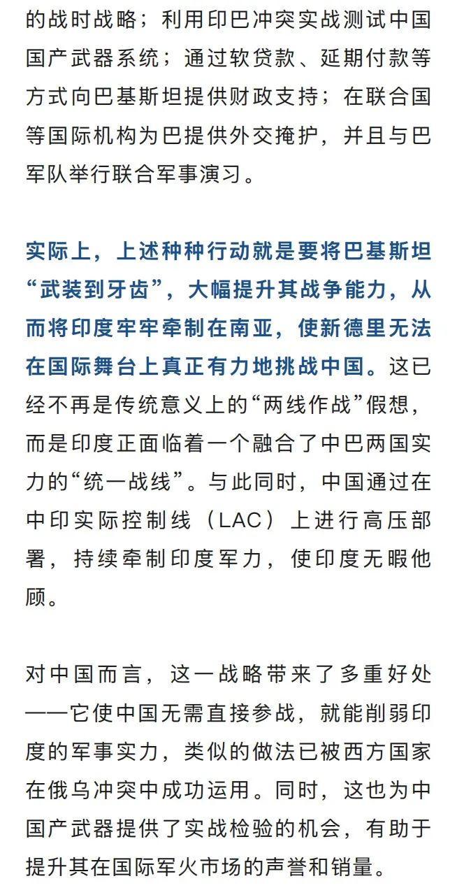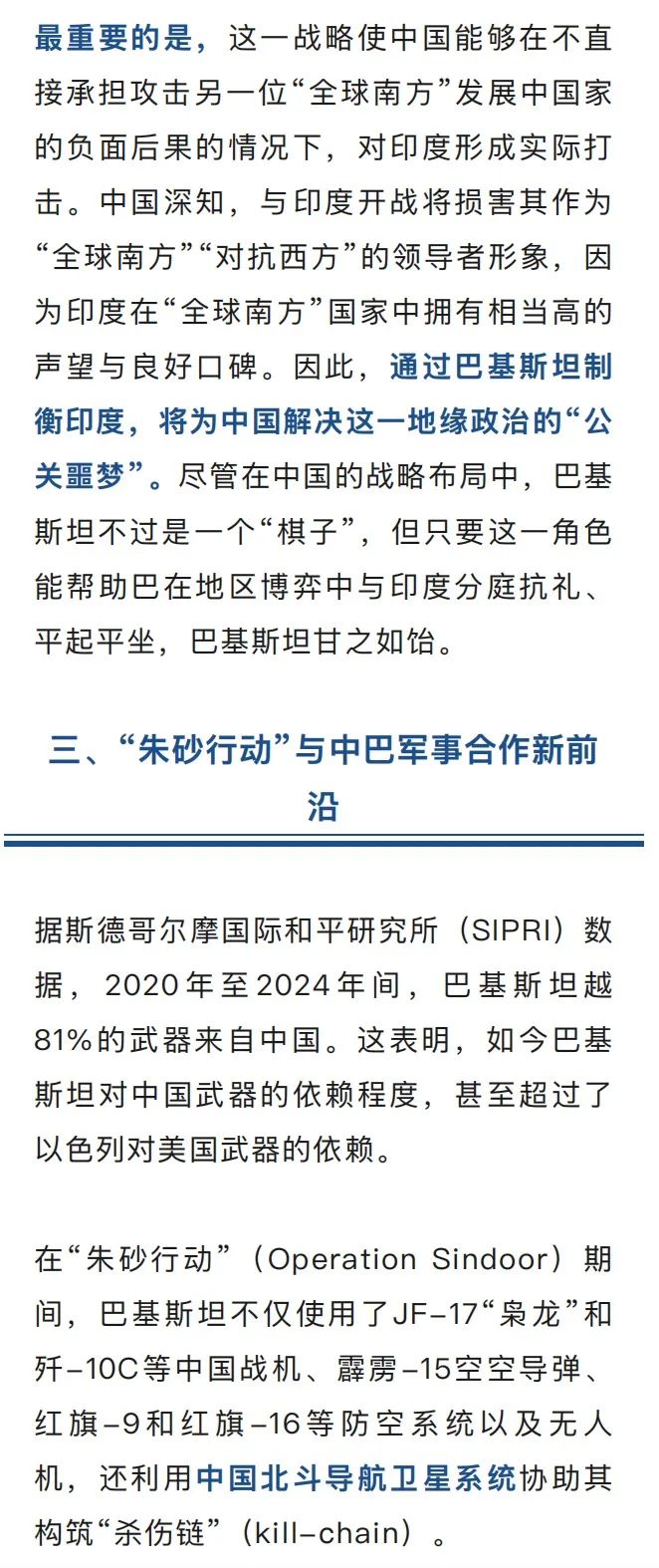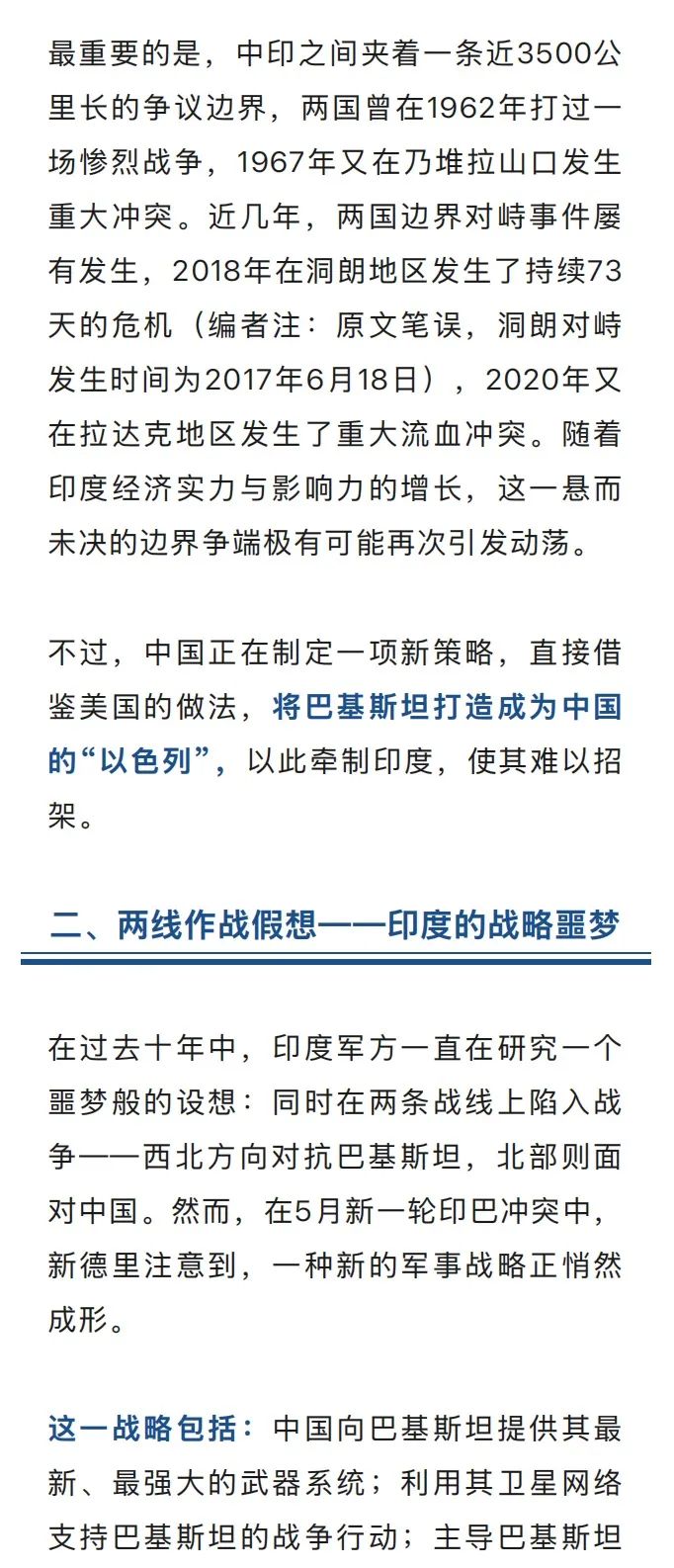 本文顯然是印度學者炮製出的又一“黑華力作”,其核心邏輯是將中巴全天候戰略合作伙伴關係類比於“美以特殊關係”。作者認為,中國為制衡快速崛起的印度而將巴基斯坦打造為中國的“以色列”以牽制印,並在“硃砂行動”期間為巴提供了大量軍事援助,使印不僅面臨西部、北部“兩線作戰”壓力,更面臨中巴聯手形成“統一戰線”的潛在威脅。文章最後,作者藉此反思了印度“多向結盟”戰略的侷限性,認為其必須在“戰略自主”與“保證關鍵時刻獲得支持”之間取得平衡。但只要深入思考即可發現,本文漏洞百出。首先,中巴“結伴而不結盟”的雙邊關係顯然無法等同於美以雙邊同盟關係;其次,如果巴基斯坦使用中國武器裝備就意味着中巴結盟,那麼按照此邏輯,使用“萬國牌”軍備的印度不正是與整個美西方以及俄羅斯結盟嗎?那又何談“戰略自主”與“關鍵時刻得不到支持”?更為關鍵的是,作者並未回答什麼是“有效的支持”?是外交聲援?是間接軍事援助?還是乾脆直接介入?因此,本文的政策建議非常模糊。總的而言,本文實則反映了印度各界對於戰敗的深層次焦慮,即其無法接受印度在單獨對抗中未能勝過宿敵巴基斯坦,因此必須為這一失敗尋找外部藉口,營造印度以一己之力對抗“中巴同盟”然後“惜敗”(甚至“略勝一籌”)的假象。南亞研究通訊特此編譯本文,供各位讀者批判參考。