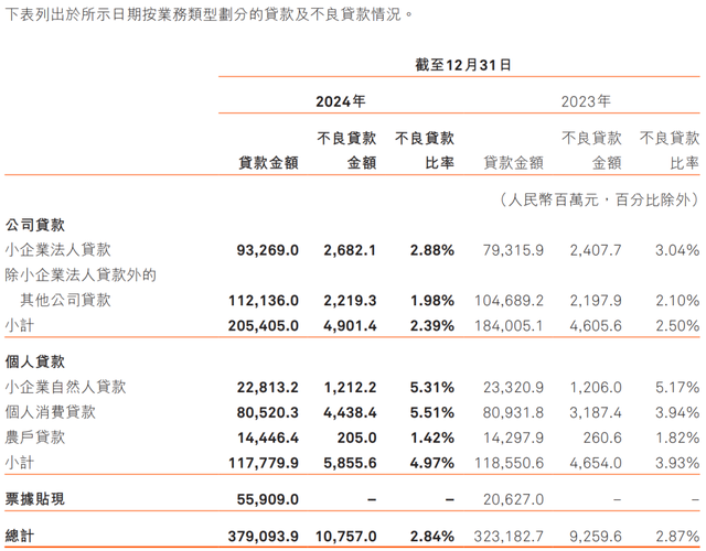 哈爾濱銀行披露的2024年度報告顯示,截至報告期末,該行個人消費貸款餘額805.20億元(佔個人貸款總額的68.36%),不良貸款餘額44.38億元(較上年末增長12.51億元),不良貸款率5.51%(全行平均不良率2.84%)。