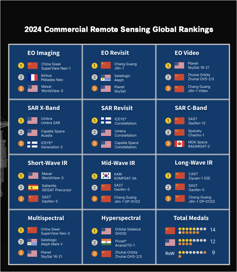 **▲**2024年10月1日,美國戰略與國際研究中心(CSIS)聯合多個機構發佈了《淘金熱:2024 年商業遙感全球排名》報告,對全球最佳商業天基遙感系統的多個性能類別進行了排名。報告稱,儘管美國仍是太空競賽的領先者,但中國已取得長足進步,中國的系統在11 個類別中奪得 5 枚金牌,美國奪得 4 枚。芬蘭和韓國等其他國家也登上了領獎台,凸顯了全球競爭的激烈程度。圖源:CSIS