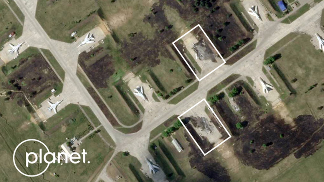 **▲**烏克蘭“蜘蛛網”行動無人機襲擊俄羅斯造成了多大破壞?NBC News等西方媒體分析了Planet Labs等獨立公司拍攝的衞星圖像,48 小時內迅速判定至少10架飛機被摧毀。圖源:Planet Labs