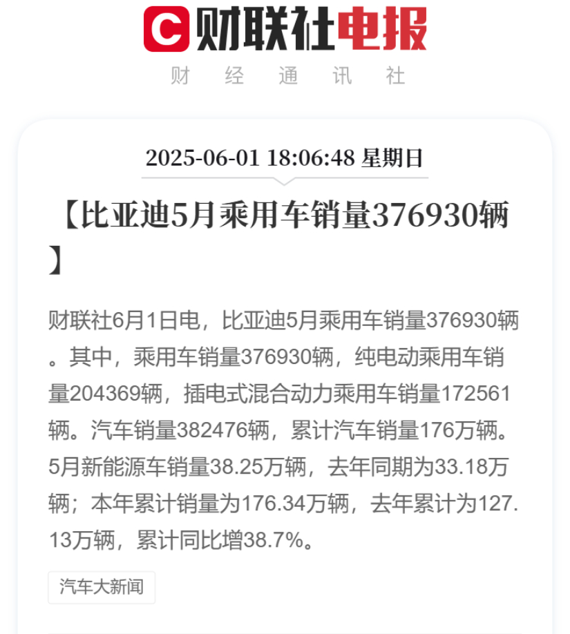 這個數據能維持住,主要靠的出口增長,比亞迪國內銷量的增長,幾乎停滯了。比如,5月份的38萬輛月銷,其中有8萬輛是供應海外的,內銷只有30萬輛。