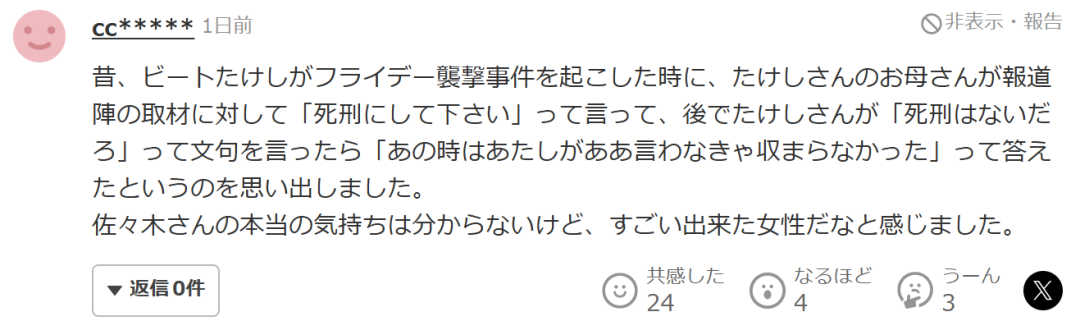 “以前,北野武發生《Friday》雜誌襲擊事件時,北野武的母親在面對媒體採訪時説了請判他死刑吧這樣的話。後來北野武抱怨説死刑也太過分了吧,他母親回答説那時候如果我不那麼説,事情就無法平息。雖然無法確切知道佐佐木女士的真實心情,但我覺得她真的是非常了不起的女性。”