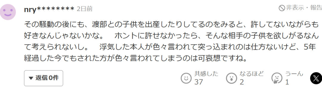 “那場風波之後,她還和渡部生了孩子,看來雖然心裏沒完全原諒,但還是有感情吧。如果真的無法原諒的話,怎麼可能會想要對方的孩子呢?出軌的人被指責是理所當然,但即使過去了五年,被傷害的一方還不斷被議論,真的讓人覺得很可憐。”