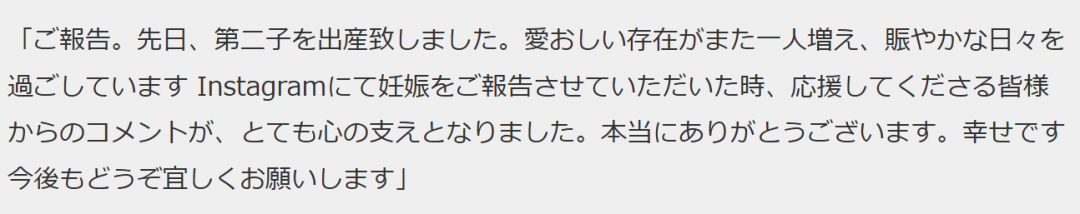 “前幾日,我順利生下了第二個孩子。家裏又多了一位可愛的小生命,每天都過得更加熱鬧了。當初在社交媒體上報告懷孕時,收到許多支持我的大家的留言,那些話語成為了我內心很大的支撐。真的非常感謝大家。我現在感到非常幸福。今後也請多多關照。”
