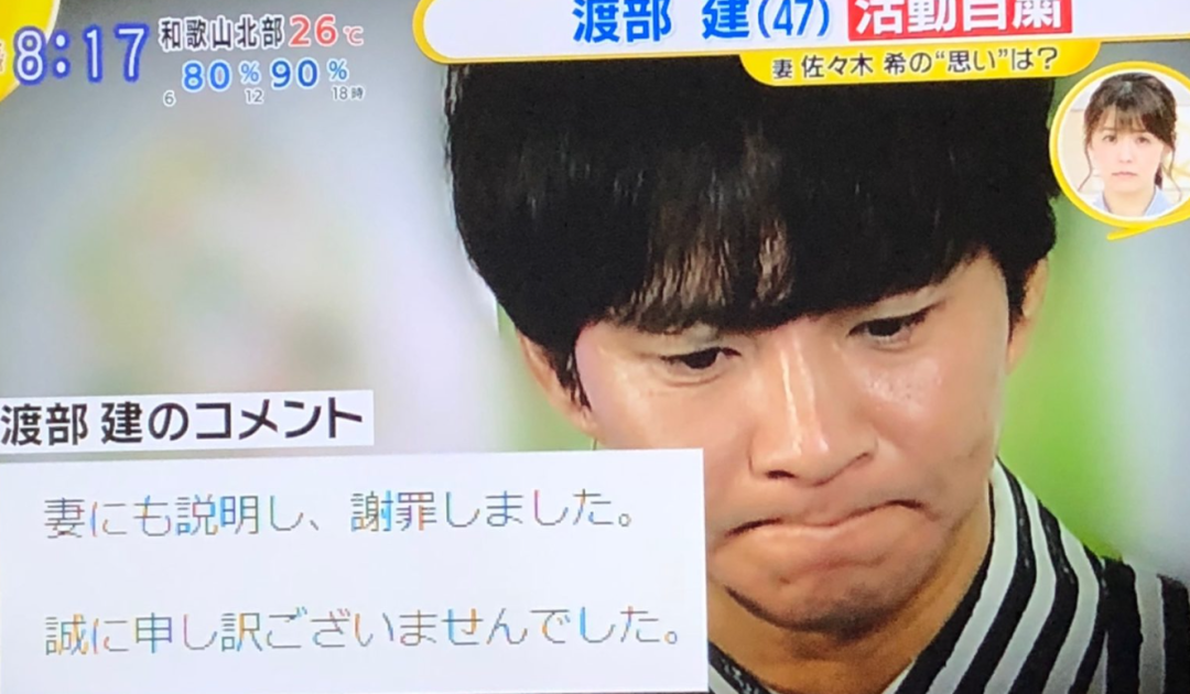 2020年,渡部建在與女演員佐佐木希結婚三年後,被著名八卦雜誌《週刊文春》爆出令人震驚的不倫醜聞。消息一出,立刻引發了日本社會的強烈震動。
