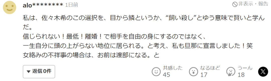 “我覺得佐佐木希的這個選擇讓我大開眼界,或者説,在養着不放的角度來看,非常聰明。不是那種難以置信!太噁心!離婚!然後讓對方自由的做法,而是讓對方一輩子都得低頭認錯,處於自己之下的地位。我也對我老公宣言了(笑):如果你出軌,你就變成渡部那樣的人!”