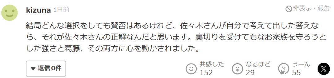 “無論最終做出什麼選擇,都會有人支持,也會有人反對。但如果那是佐佐木女士自己深思熟慮後得出的結論,那就是她自己的正確答案。即使遭受了背叛,她依然想守護家庭——那份堅強與內心的掙扎,這兩者都深深打動了我。”