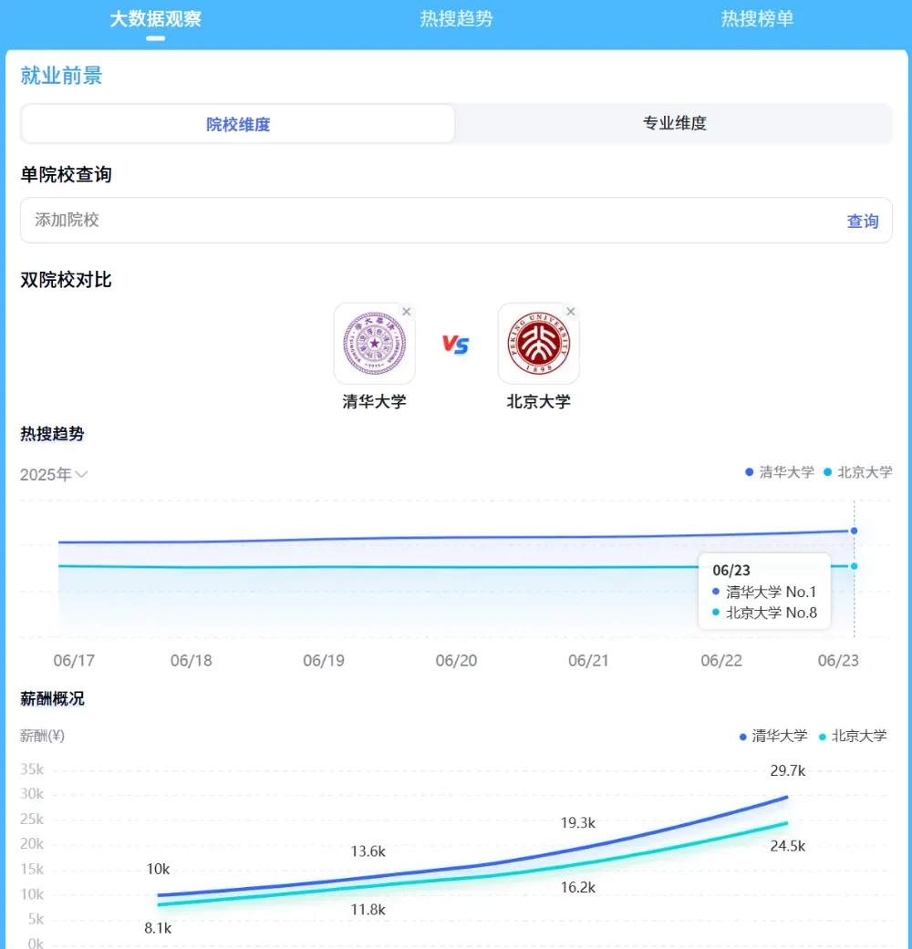 另外,當考生面對多個心儀的院校和專業,無法決定志願填報的順序時,百度還推出了“就業前景”板塊中的對比功能,能夠更客觀地進行決策。
