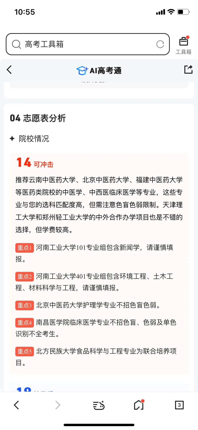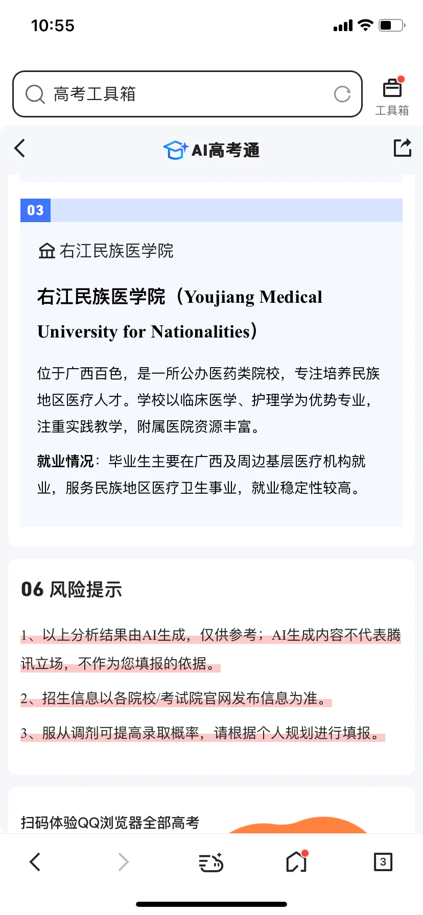 同樣,我們在QQ瀏覽器輸入相同的條件,讓其生成一份高考志願報告。QQ瀏覽器給出了包括考生信息、策略説明、志願表詳情、志願表分析、重點院校解讀、風險提示六個板塊的信息,雖然比夸克多了重點院校解讀這一部分,但整體內容詳實程度不如後者。