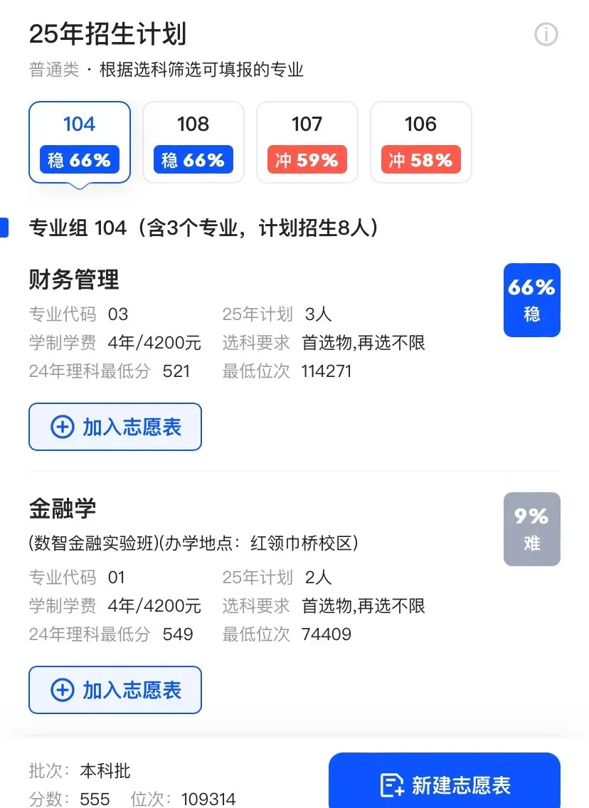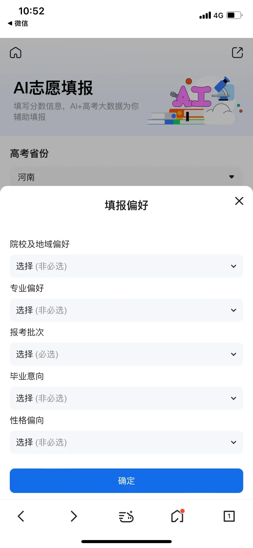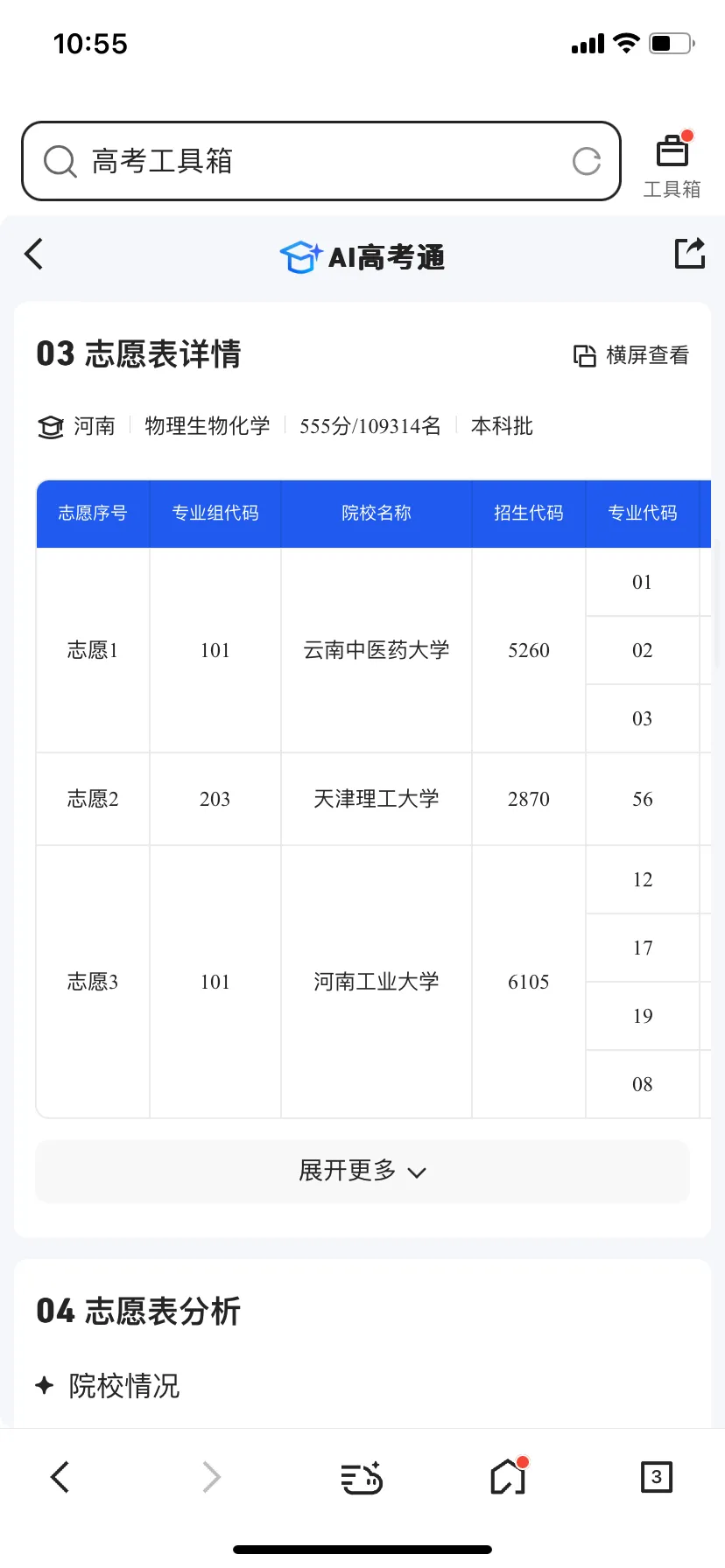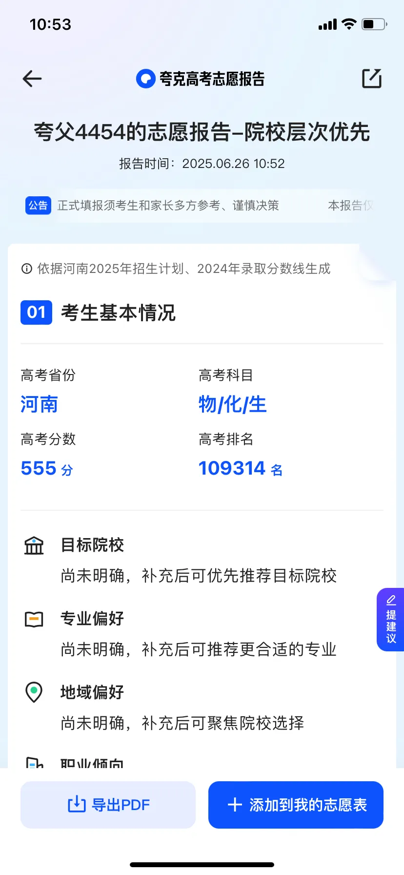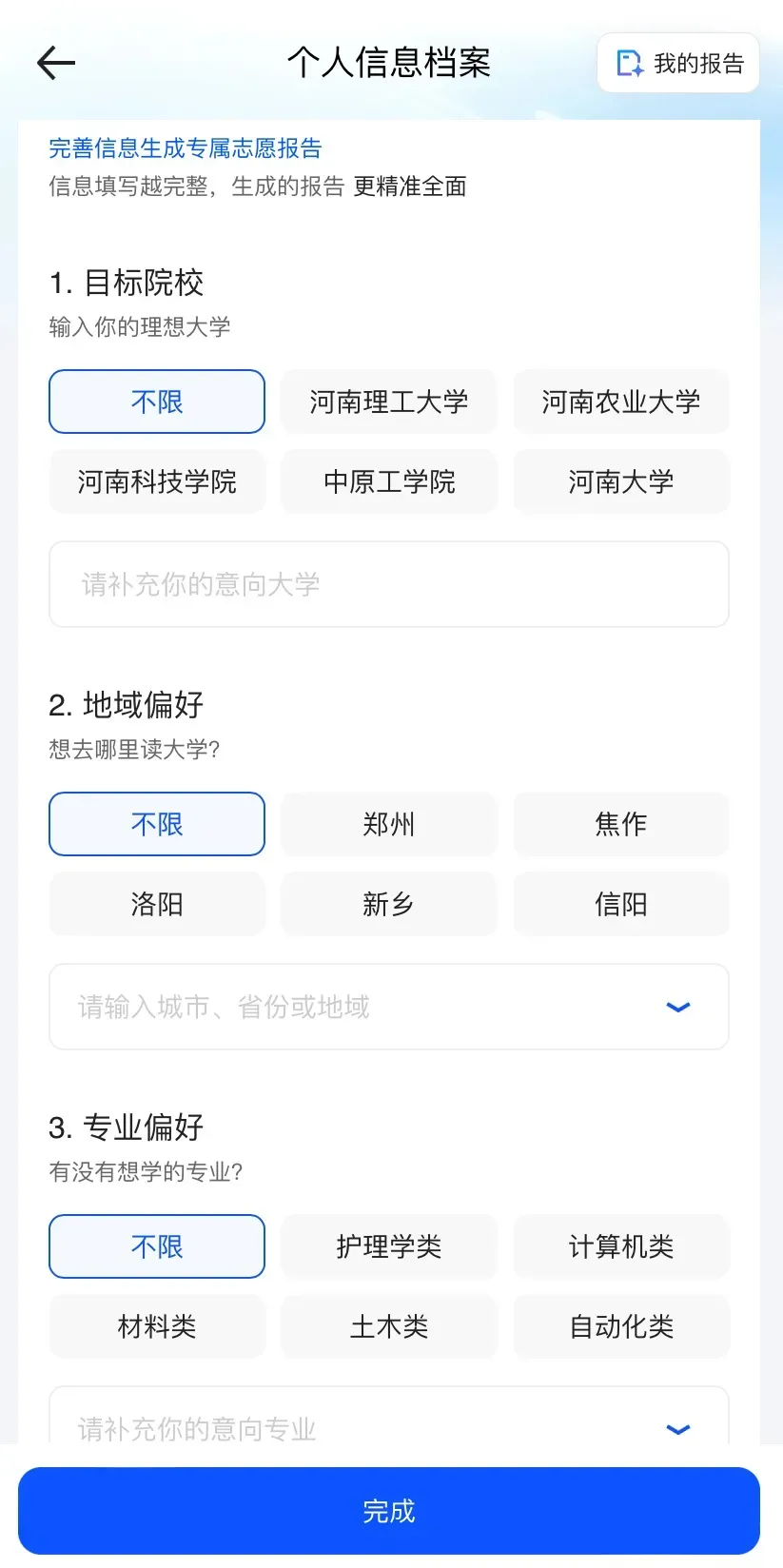 我們在這裏將高考省份選在河南,科目為物化生,成績定為555分,目標院校、地域偏好、專業偏好等興趣偏好都選擇不限,補充信息填寫為“需要好就業”。