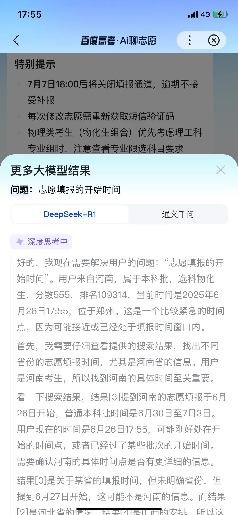 而且在百度的AI聊志願中,還可以查看多個大模型的結果,包括DeepSeek-R1等通用大模型結果,可參考性更高。
