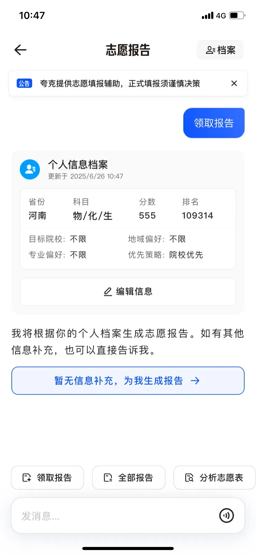 首先還是夸克。前文提到夸克支持填寫個人信息檔案,分別包括目標院校、地域偏好、專業偏好、優先策略、畢業規劃、職業傾向、學費傾向以及其他可填的個人愛好、家庭背景等信息。