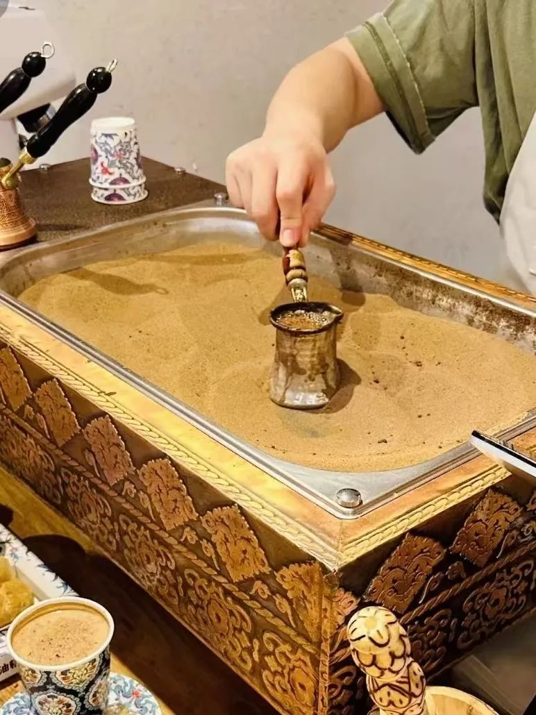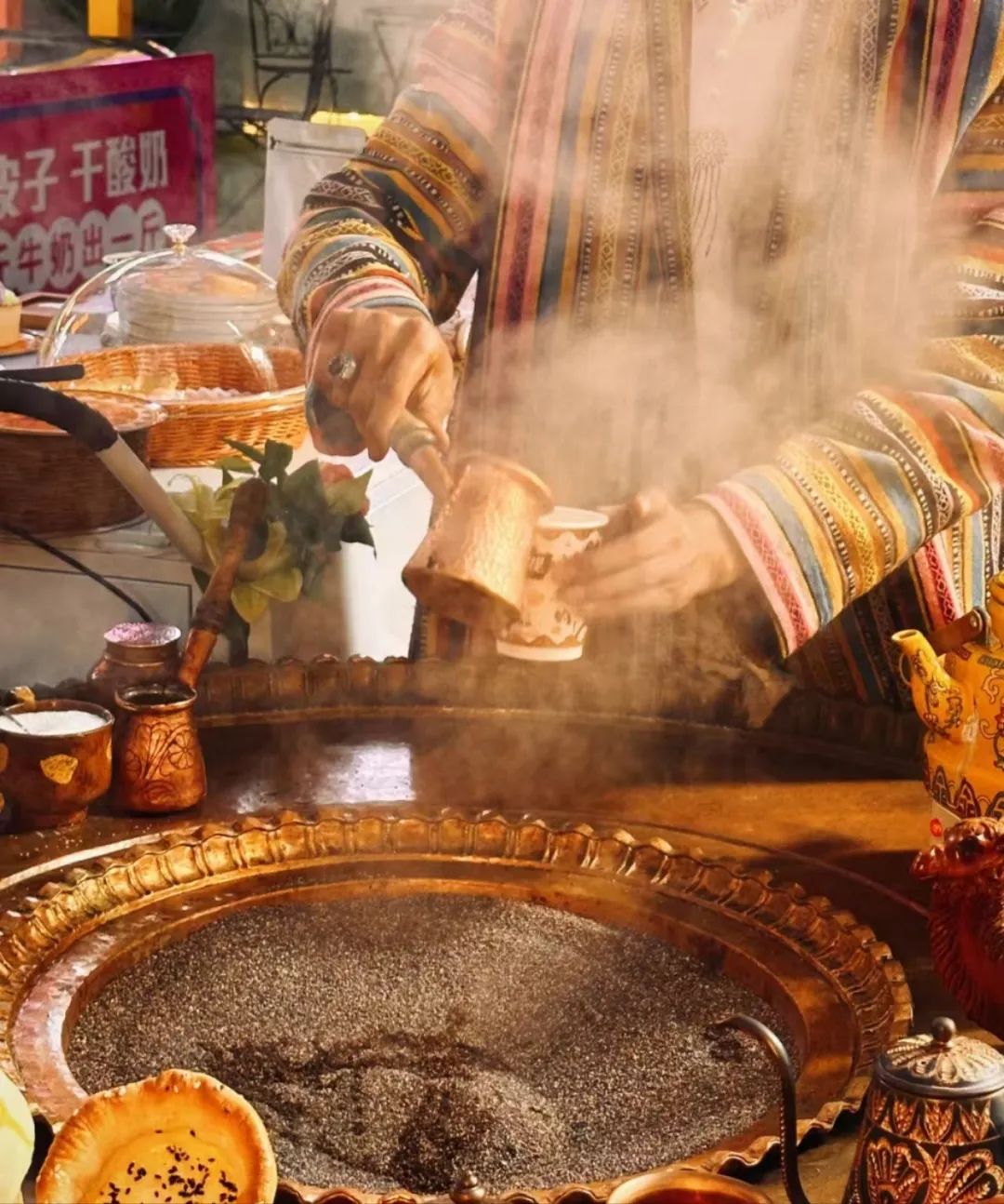 揭開壺蓋,咖啡的香氣裹挾着一絲煙火氣撲面而來,抿上一口,微苦中帶着焦香,讓人回味無窮。這種獨特的煮制方式,不僅是一種烹飪技藝,更是新疆人民與自然和諧共處的智慧結晶。