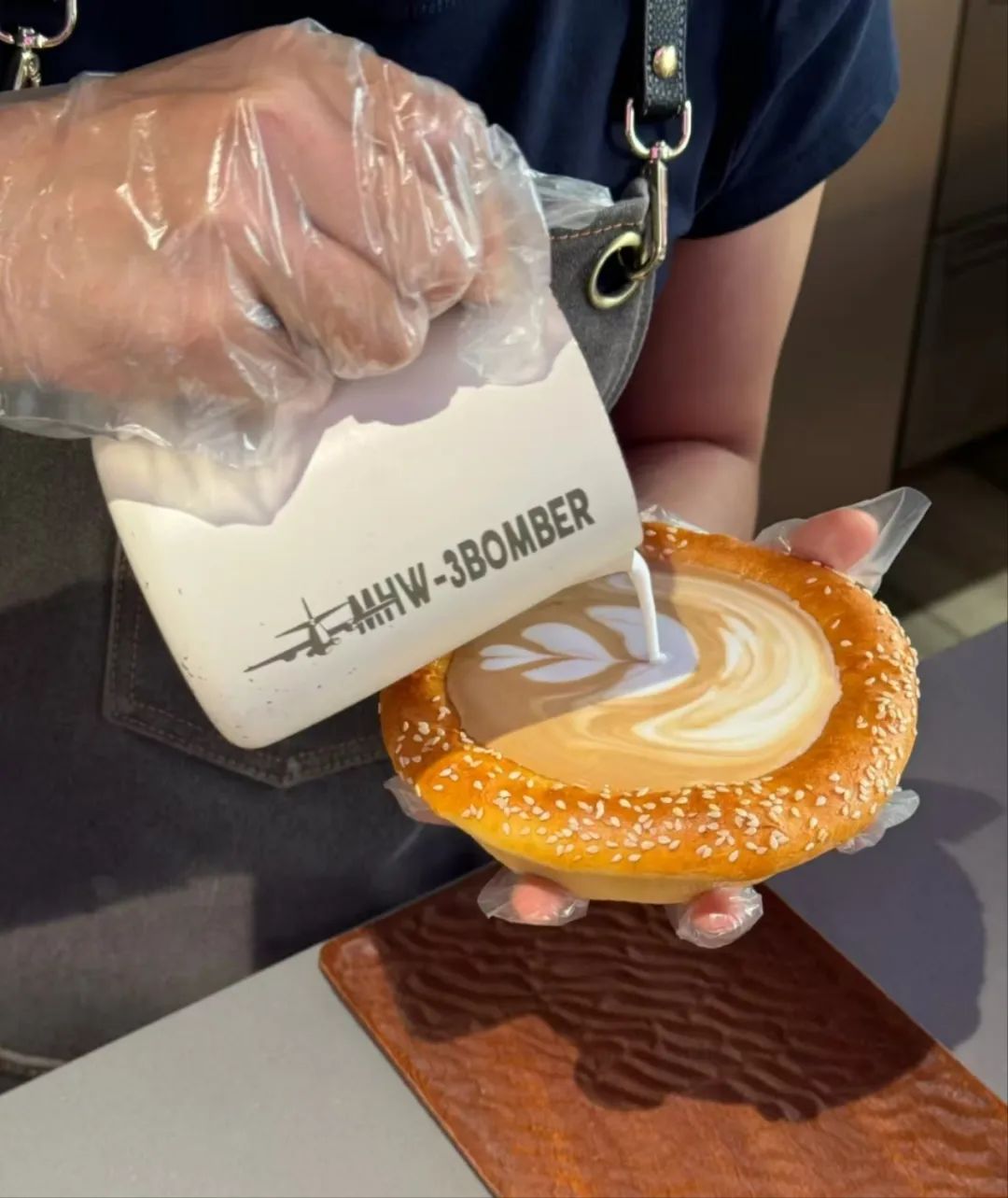 接着,緩緩倒入打發好的奶泡,拉出各式各樣的圖案。奶泡與饢的邊緣接觸,形成了一種奇妙的融合,既保留了奶泡的綿密,又讓饢吸收了部分奶香。