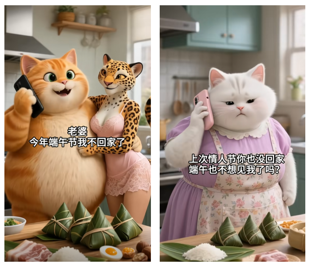 比如上一個鏡頭裏,橘貓老公出軌豹子,可憐的糟糠之妻還在家裏包棕孑。