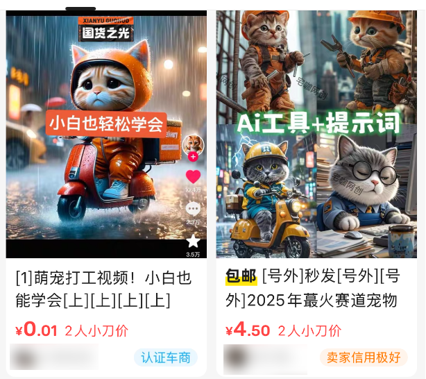 圈子裏開始了收徒制,頭部博主們搞知識付費,帶新人批量起號。在閒魚、淘寶上,你也能找到所謂的定製 AI 貓咪寵物短劇服務,或者是賣視頻製作教程的。