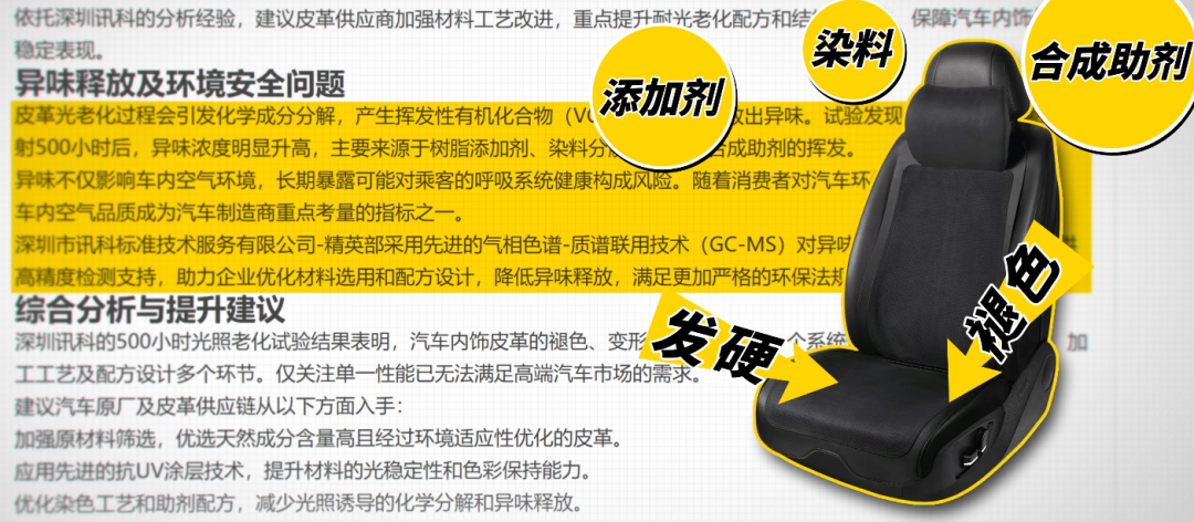 深圳某個測試機構就出過一份老化報告,説只需要 500 個小時的紫外線燈照射,內飾的皮質就會出現明顯的發硬、褪色,從添加劑、染料和合成助劑裏揮發出來的揮發性有機物濃度也會升高。