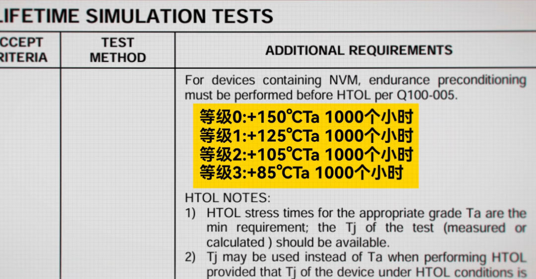 最低要求的 grade3 級別的是經受 85 度的高温 1000 小時,最高的 grade 0 則要扛住 150 度超高温 1000 小時。