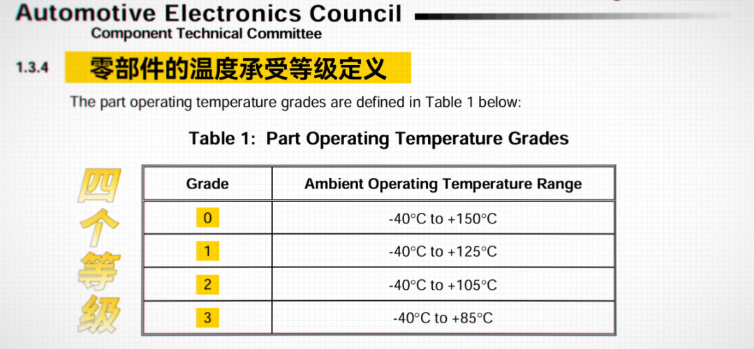 雖然性能從低到高分成了 Grade3 到 Grade0 四個等級,但大夥看即使是最差的 Grade 3 也要求電子零件的温度耐受範圍達到零下 40 度到零上 85 度。