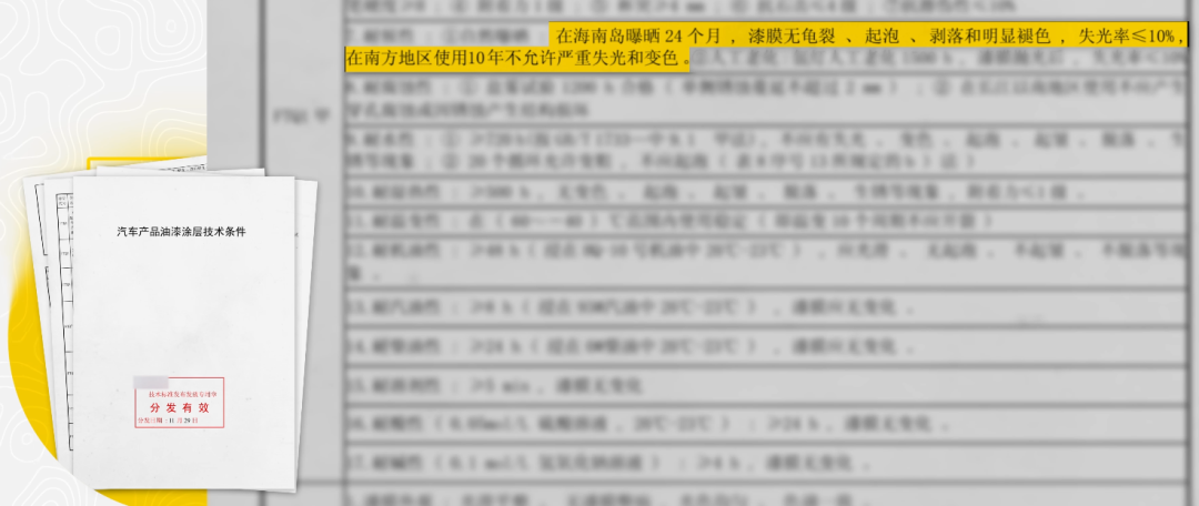 就比如某三線國內車企對於車外裝飾性塗層的耐候性要求,就是在海南島的自然條件下暴曬連續 24 個月,都不能出現龜裂、起泡和明顯褪色,失光率不超過 10% 。在南方地區十年內,都不允許出現嚴峻失光和變色。