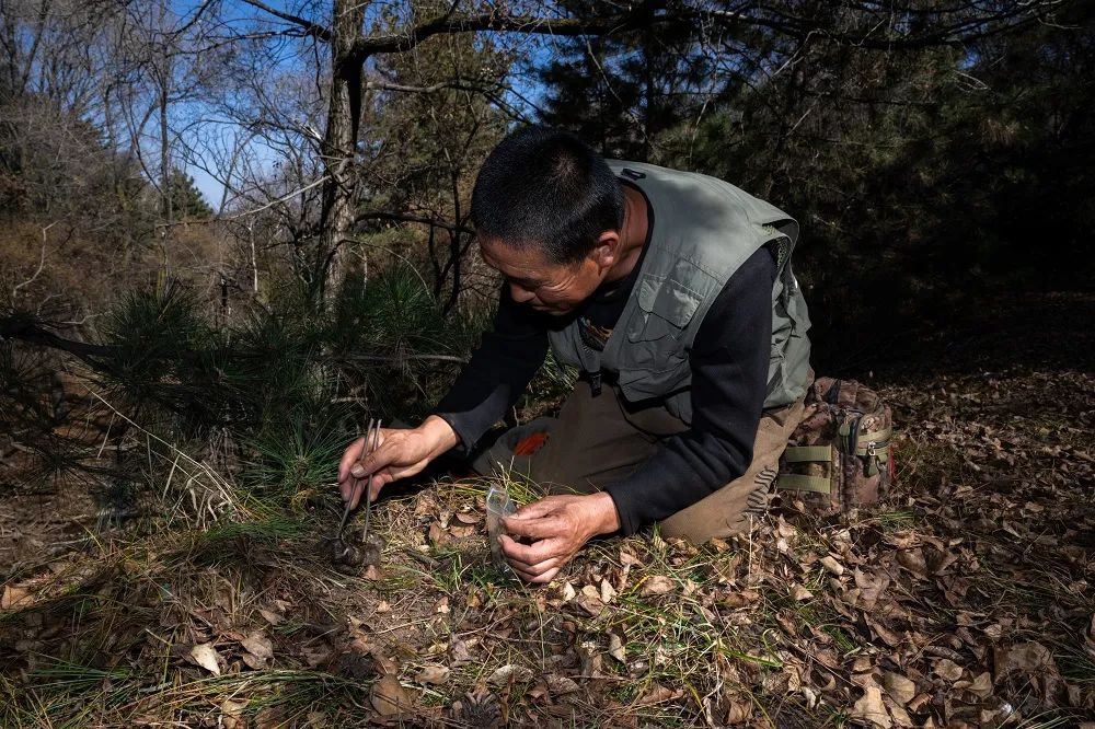 本地村民組成的巡護隊“老豹子隊”成員二寶叔在收集野生動物糞便 ©王爍