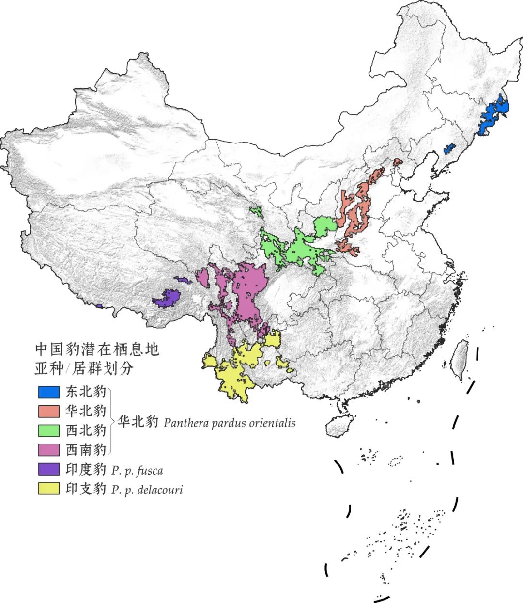 根據IUCN亞種合併的觀點,中國豹的地理分佈單元如上圖所示。 ©馬子馭
