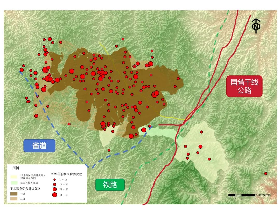 以國道(右邊紅線)為界,東邊的區域被稱為東鄉。相較2023年,東鄉出現了多個華北豹分佈點位。製圖:趙瑩