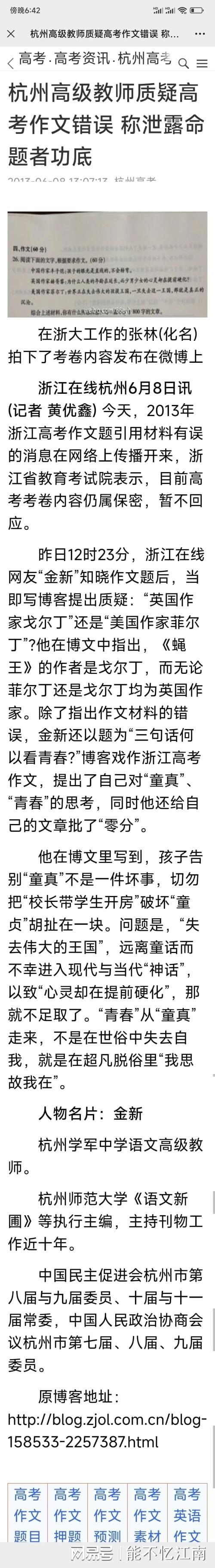 記得浙江在線2013年6月8日曾刊登記者黃優鑫題為《杭州高級教師質疑高考作文錯誤,稱泄露命題者功底》的快訊:“今天,2013年浙江高考作文題引用材料有誤的消息在網絡上傳播開來,浙江省教育考試院表示,目前高考考卷內容仍屬保密,暫不回應。昨日12時23分,浙江在線網友‘金新’知曉作文題後,當即寫博客提出質疑:‘英國作家戈爾丁’還是‘美國作家菲爾丁’?他在博文中指出,《蠅王》的作者是戈爾丁,而無論菲爾丁還是戈爾丁均為英國作家。除了指出作文材料的錯誤,金新還以題為‘三句話何以看青春?’博客戲作浙江高考作文,提出了自