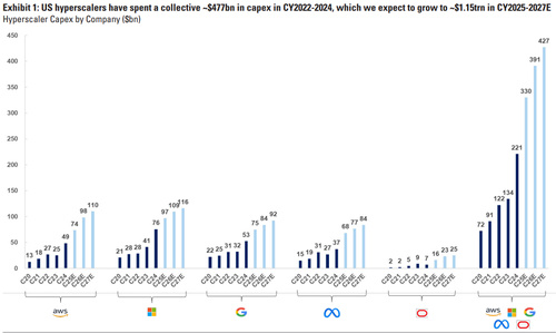2. 美國一些巨型公司似乎進入了“賺大錢非常容易”的癲狂狀態,並在利潤支持下,大幅增加資本開支狂投AI。圖為美國五大雲計算平台公司的資本開支,亞馬遜、微軟、谷歌、Meta、甲骨文。2022-2024年,五家公司資本開支4770億美元,而2025-2027年預計增長至1.15萬億美元。正是這些公司的數據中心大訂單,將英偉達頂成了全球公司市值第一。