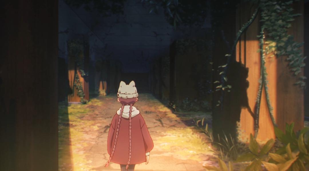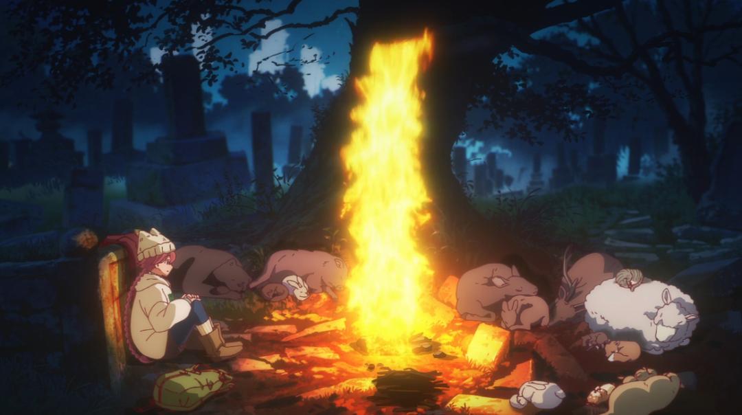 遠行的八千代在墓地休息。她用打火石點燃篝火,小動物被火光吸引留在她的身旁。