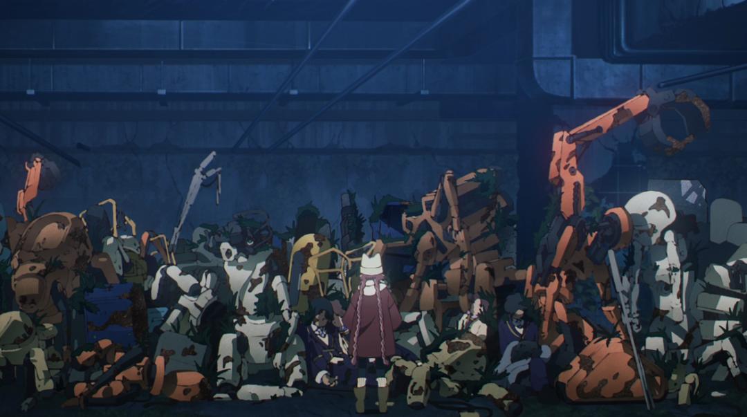 最後八千代在廢墟里遇到了一個報廢已久的服務機器人。在確認對方無法修理後,她歉意躬身,從她身體裏換到了仍可以使用的零件。