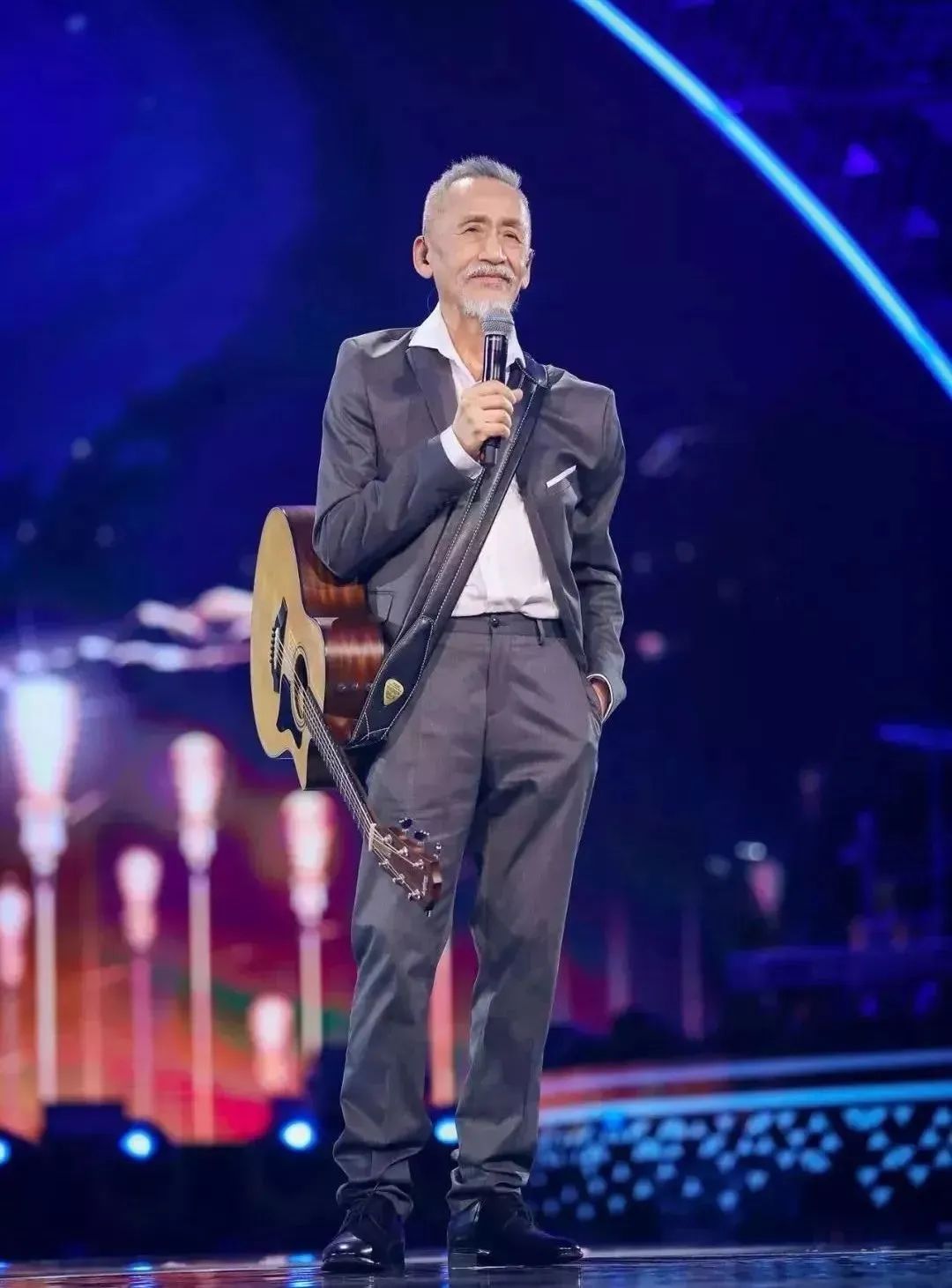 一位清瘦的白髮老人身穿套裝西服,揹着吉他,“東風夜放花千樹”的聲音一出,震撼在場所有人。他的聲音滿腔豪情,將每一句詩詞唱得鏗鏘有力,舉手投足間盡是大師姿態。