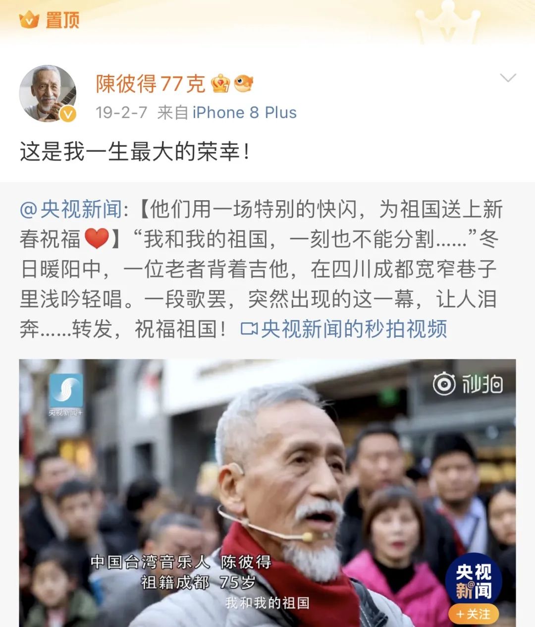 直到離世,陳彼得的置頂微博,還停留在2019年春節期間,他在成都寬窄巷子淺吟輕唱《我和我的祖國》的視頻。