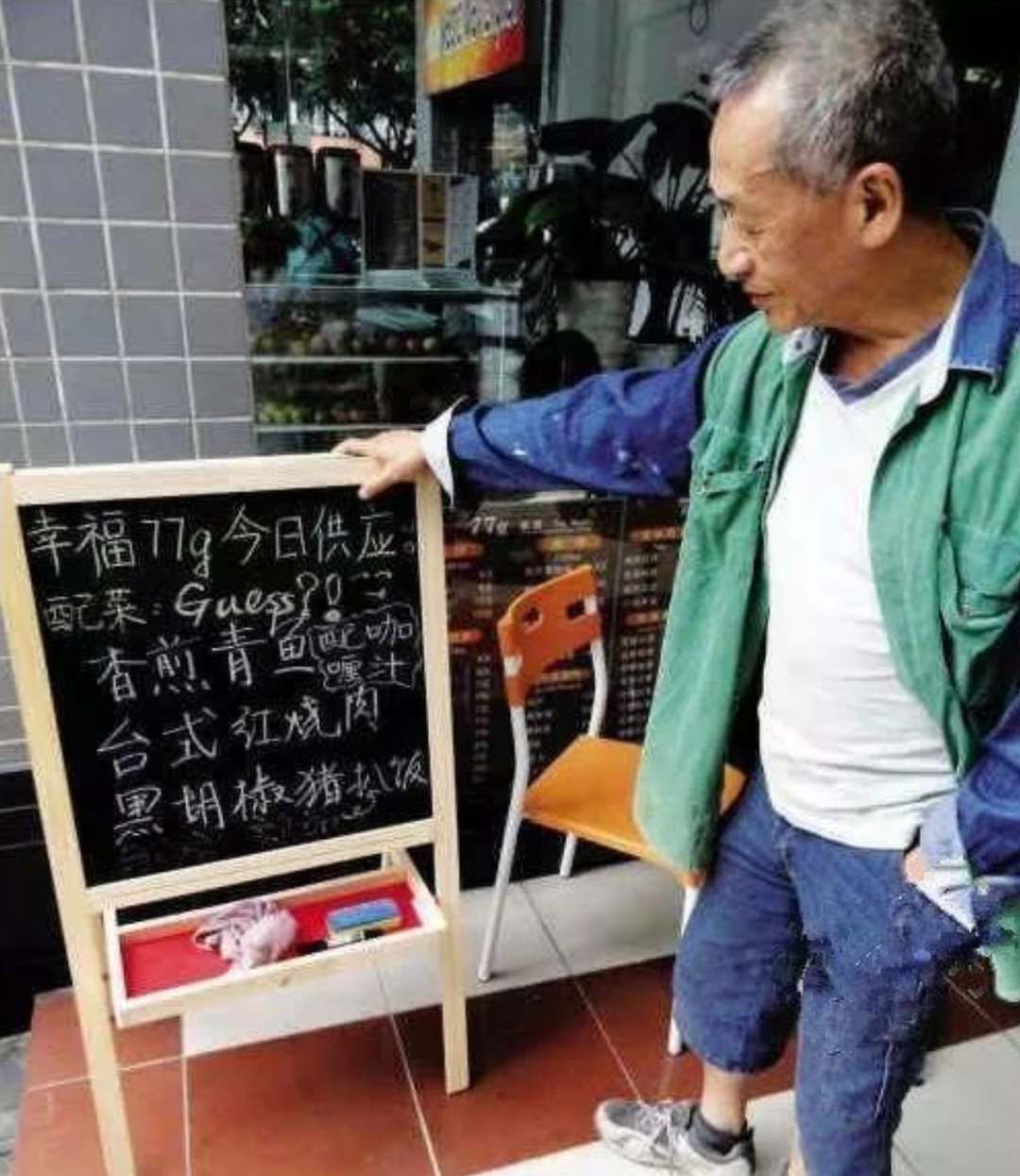 在廣州麗江花園小區,陳彼得開了一家名叫77g的小餐廳,沒有固定菜單。他每天會在門口的小黑板上,根據當天的新鮮食材寫下最新食譜。