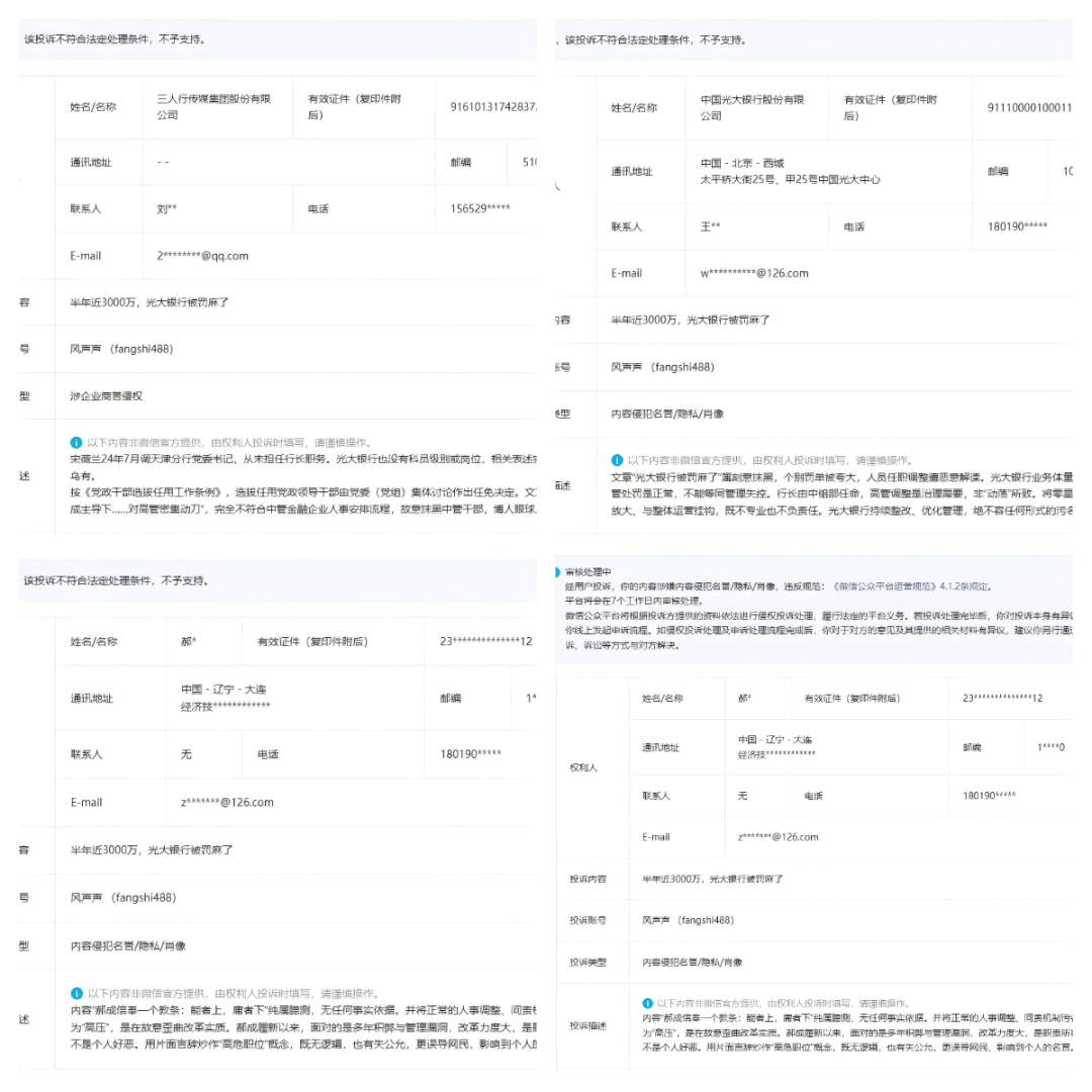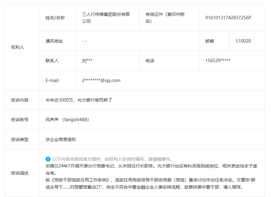投訴理由有一條是,文中關於光大銀行某職員的履歷表述不正確。