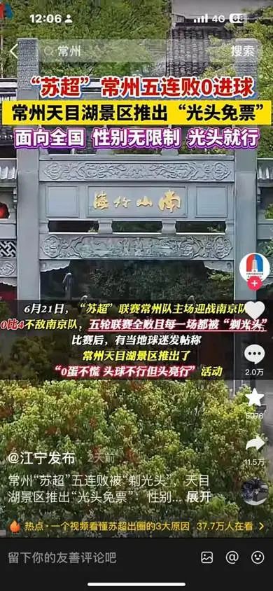 平心而論,最近抖音裏最火的當屬蘇超,連帶着江蘇的景區也開始跟着圈流量,常州隊蘇超零進球五連敗被剃光頭之後,常州天目湖推出了光頭遊客免門票的優惠。