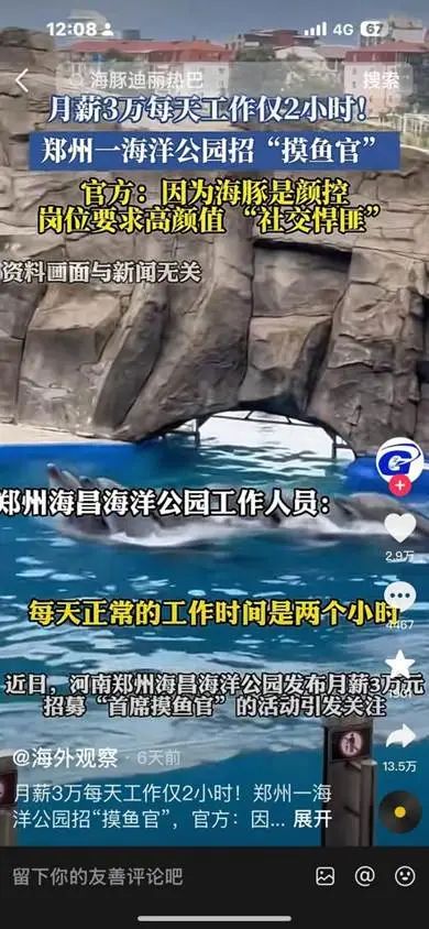 還有,比如河南鄭州海昌海洋公園月薪三萬招聘高顏值摸魚官,主要負責工作是摸海豚。