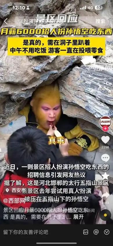 邯鄲太行五指山景區,月薪6000招募孫悟空在五指山下趴着,負責吃遊客投餵,“不用吃中午飯”。