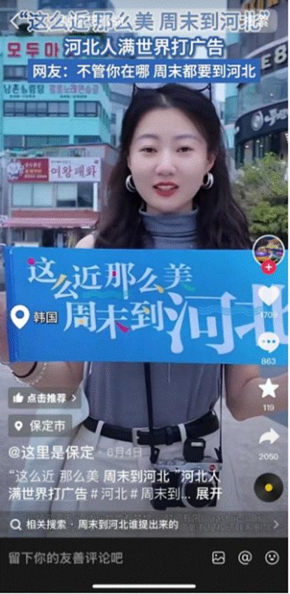 我印象裏,開始搞抽象破圈的應該是河北文旅,“這麼近那麼美,週末到河北”的藍色手旗,打到了世界各地。