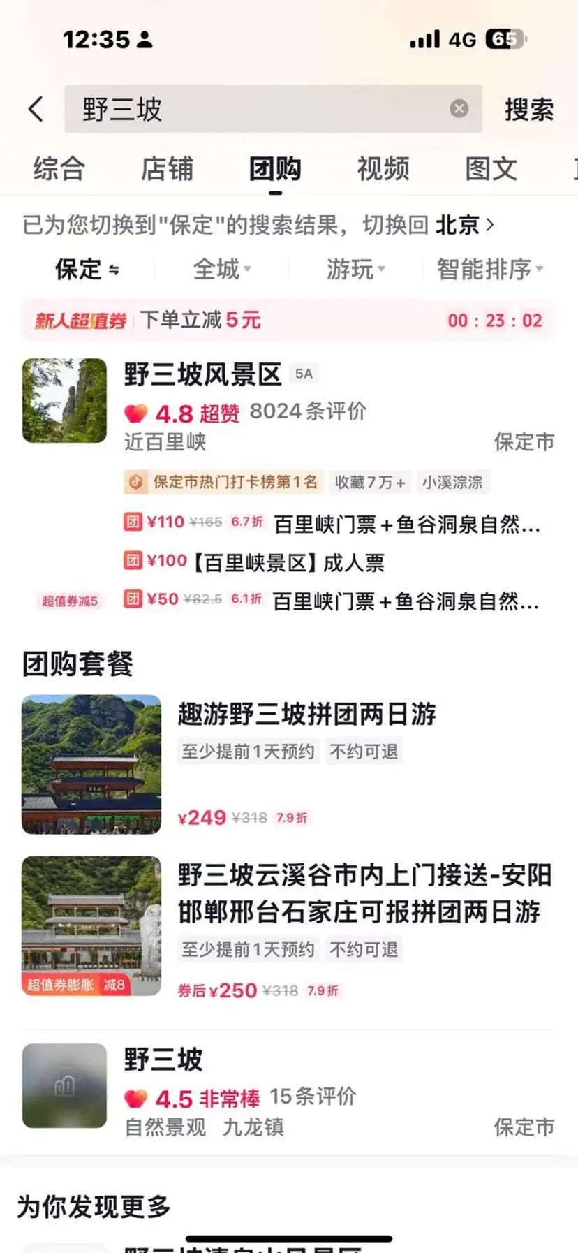 在抖音的團購中,野三坡套票從165打折到110元,而新人券下單直減5元,這也讓野三破直衝當地熱門打卡榜第一名。