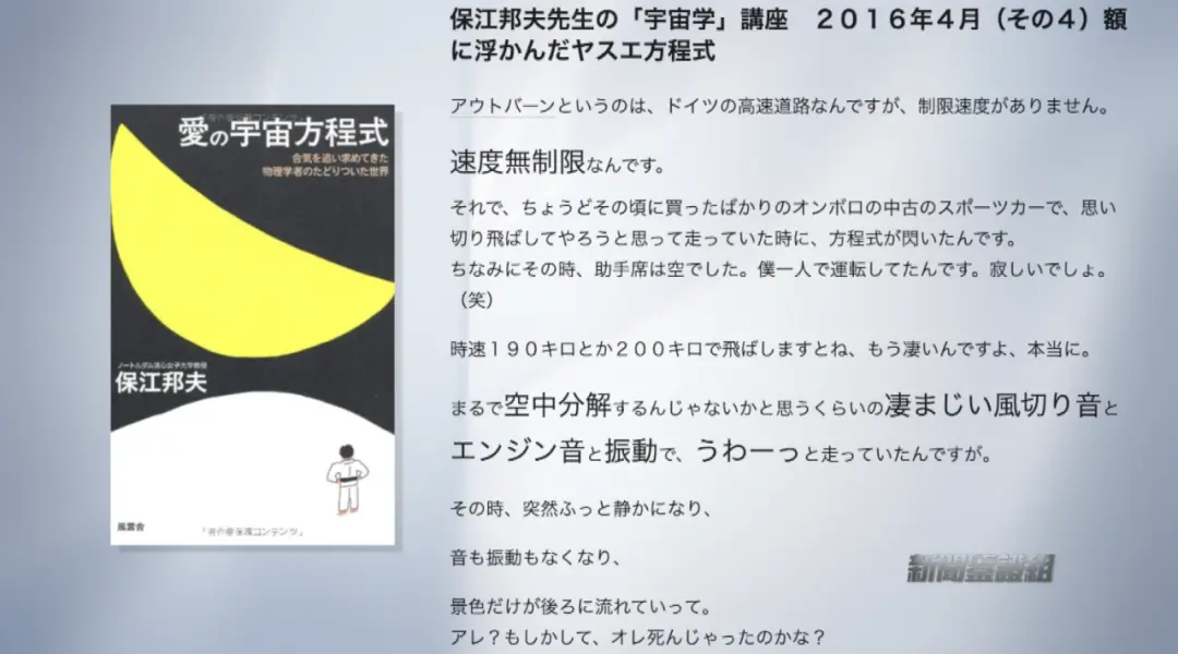 調查到這裏的時候,我們以為保江邦夫是個科學家,但是繼續往下深挖,有意思的事就來了。保江這個人有點神,他經常會宣稱自己能獲得一些“神秘力量”的青睞,得到奇怪的心靈感應或者腦電波。比如,這個所謂知名的保江方程式就不是他算出來的,而是偶然在他腦子中自己“跳出來”的。