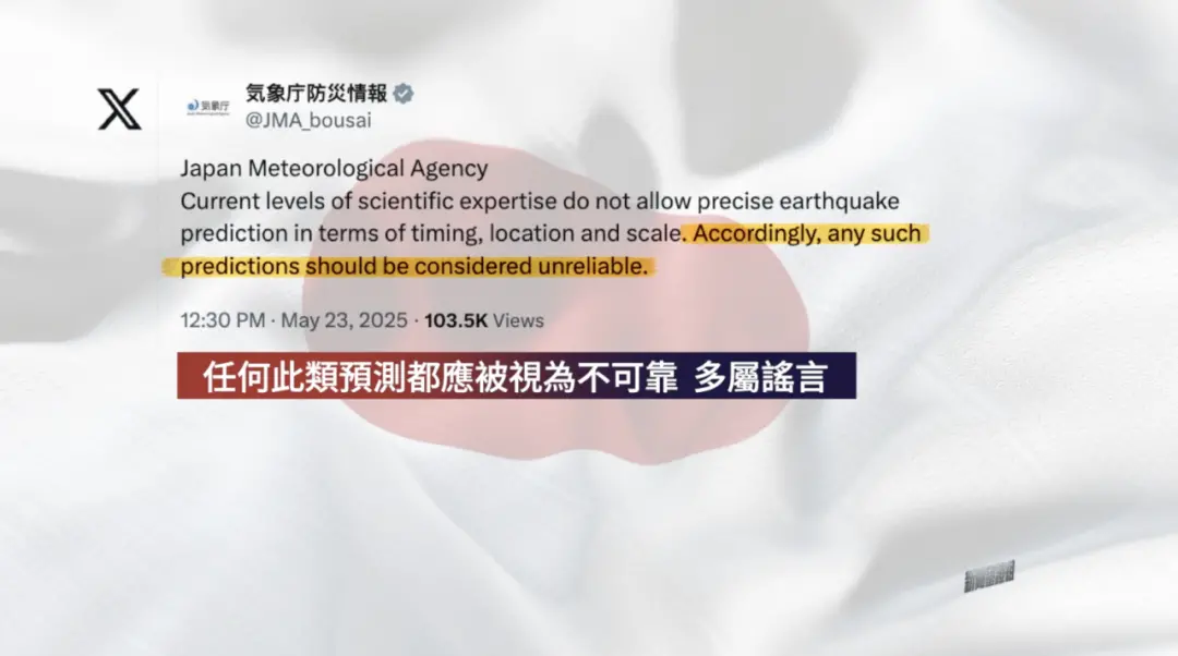 5月23日,日本氣象廳在其官方社交媒體賬號上發文稱:“日本氣象廳目前的科學水平還無法準確預測地震的時間、地點和規模。因此,任何此類預測都應被視為不可靠,多屬謠言。”