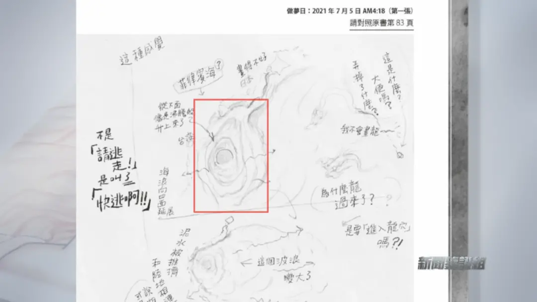 這個夢,龍樹諒説是她在2021年7月5日凌晨4點多夢到的,關於手繪圖表述的可能發生海嘯的位置和方式,她本人則用地圖做了解釋。