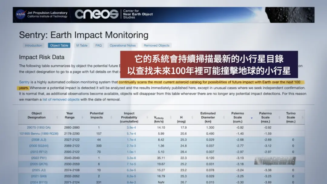 一直以來,NASA都在利用先進的機器人、航天器等探索太陽系中的所有天體。旗下的“哨兵”地球撞擊監測網站,也在不斷公佈數據。據“哨兵”網站顯示,它的系統會持續掃描最新的小行星目錄,以查找未來100年裏可能撞擊地球的小行星,一旦檢測到潛在撞擊,系統就會進行分析,並立即在此發佈結果。而在網站中所公佈的數據表格內,我們並沒有找到可能對地球造成威脅的小行星數據,最近的有可能對地球有威脅的小行星,預測撞擊年份是2026年,且潛在影響指數只是最低的數值1。