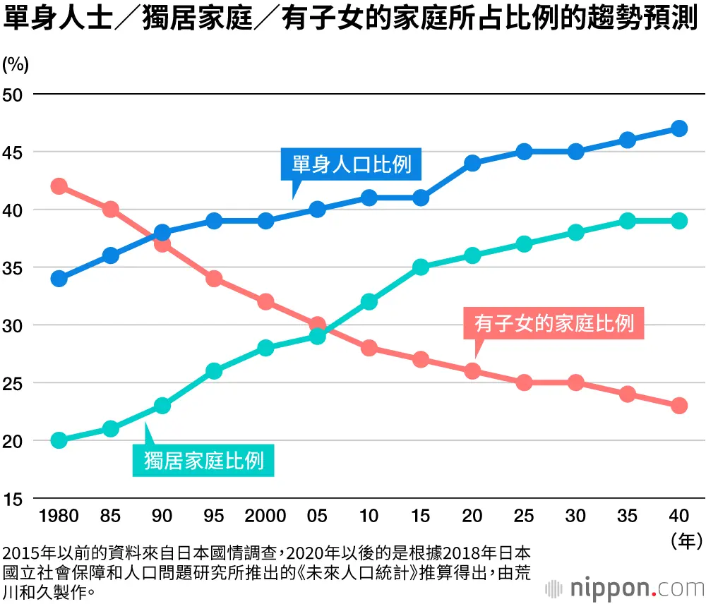 與此同時,日本“獨居家庭”佔比達38%,成為最普遍的家庭構成,在首都東京52%的家庭只有一個人。