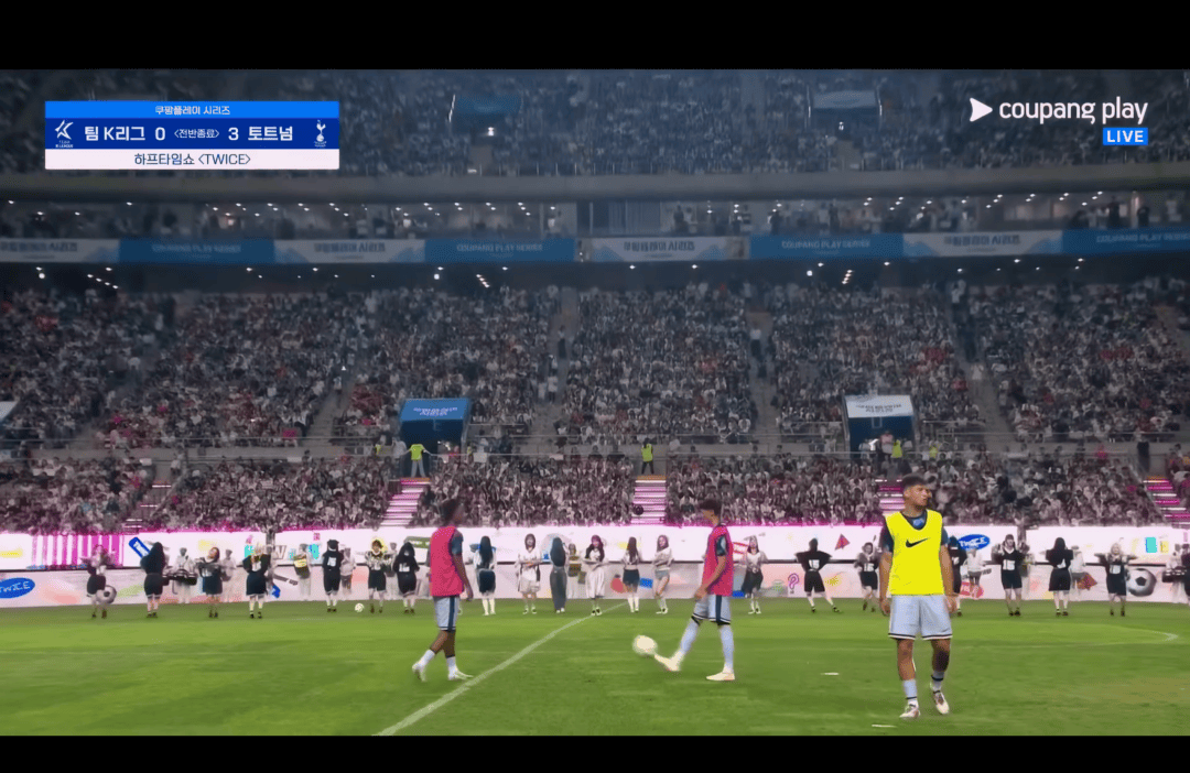 在去年熱刺隊的韓國行中,主辦方分別邀請了女團TWICE和NewJeans擔任兩場友誼賽的中場秀嘉賓。但由於中場休息的時間限制,舞台不僅沒有任何裝置搭建,歌曲安排緊湊,還有正在熱身的運動員時不時走進鏡頭,嚴重影響演出的呈現效果。