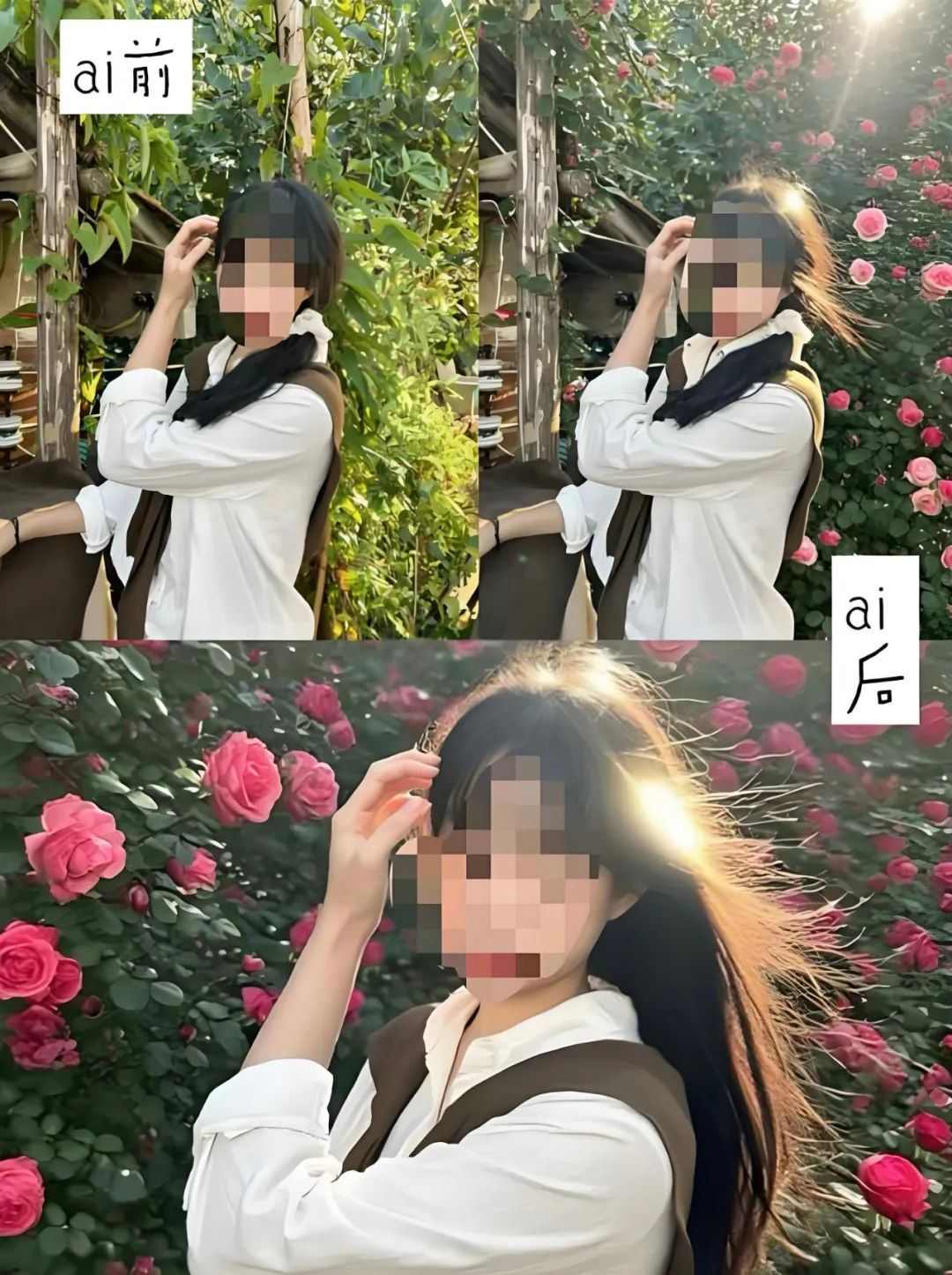 再比如湖南的皮皮,自己拍了一些人像寫真,雖然人物表情十分完美,但背景並不是特別滿意,在她拜託了豆包AI之後,原本只有一點的花叢,鋪滿了整個屏幕,原本只能躺在相冊裏的廢片,瞬間成為了“人生照片”。