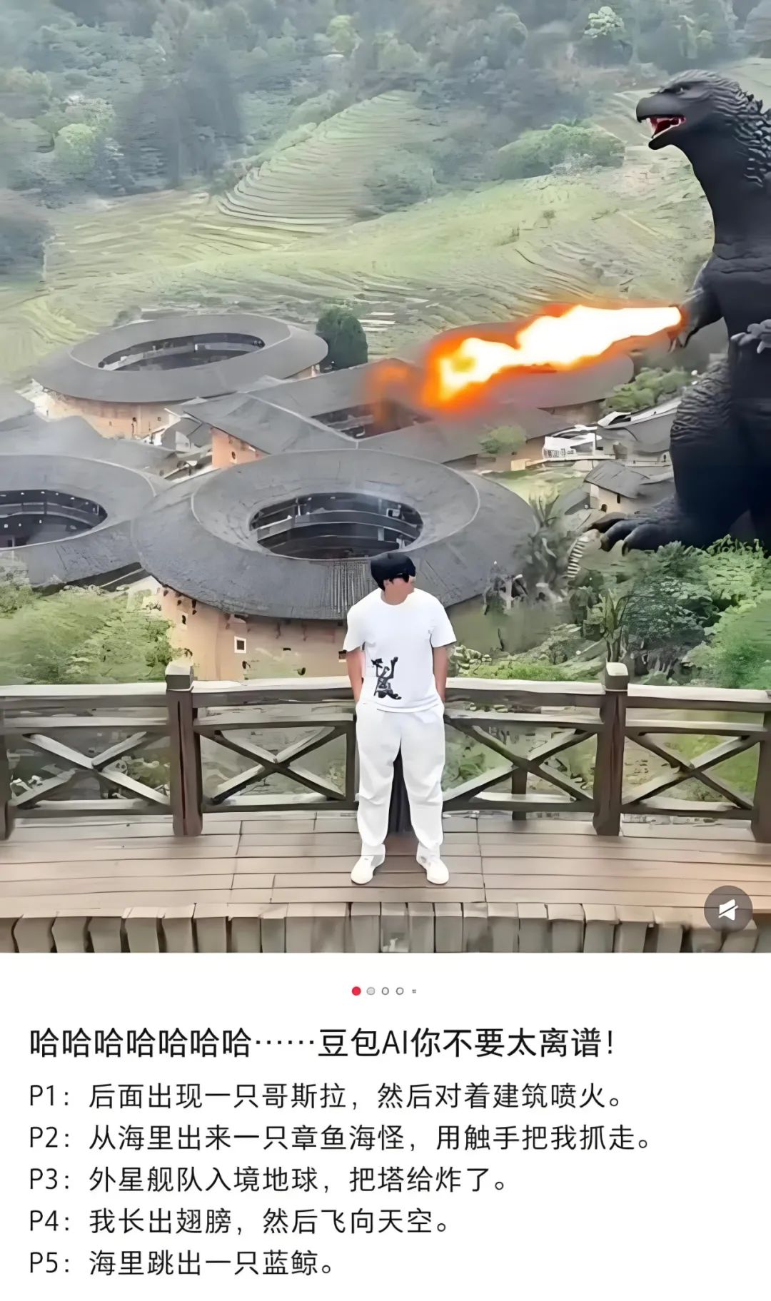 但當他在豆包AI上輸入哥斯拉相關的指令之後,原本平平無奇的隨手拍,變成了極具戲劇性和科幻感的動態live,原本古色古香的福建土樓,瞬間成為了科幻大片裏的拍攝現場。
